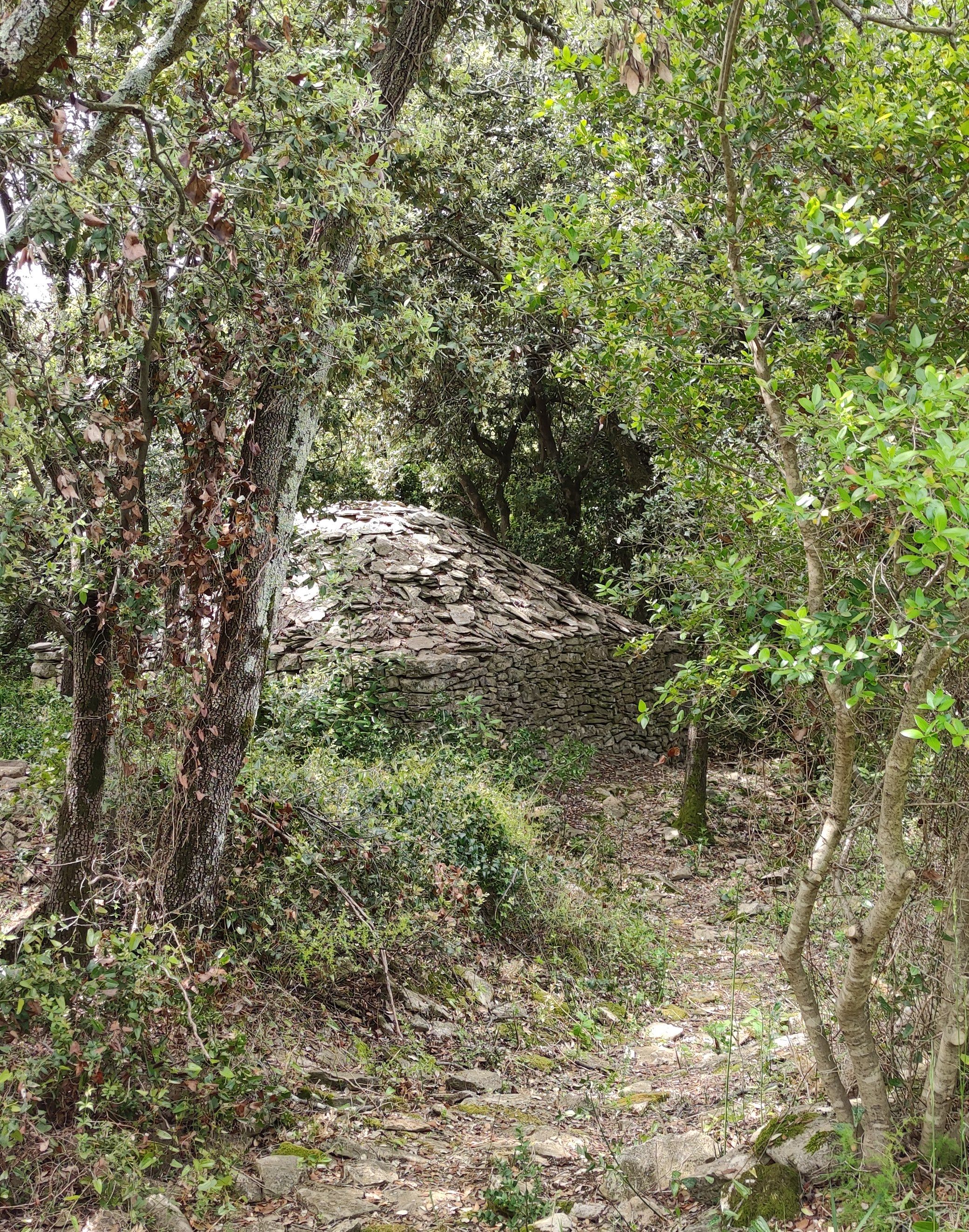 Première capitelle (borie) vue, sur la gauche du chemin. Il faut en faire le tour pour voir l'entrée (voir la photo suivante).