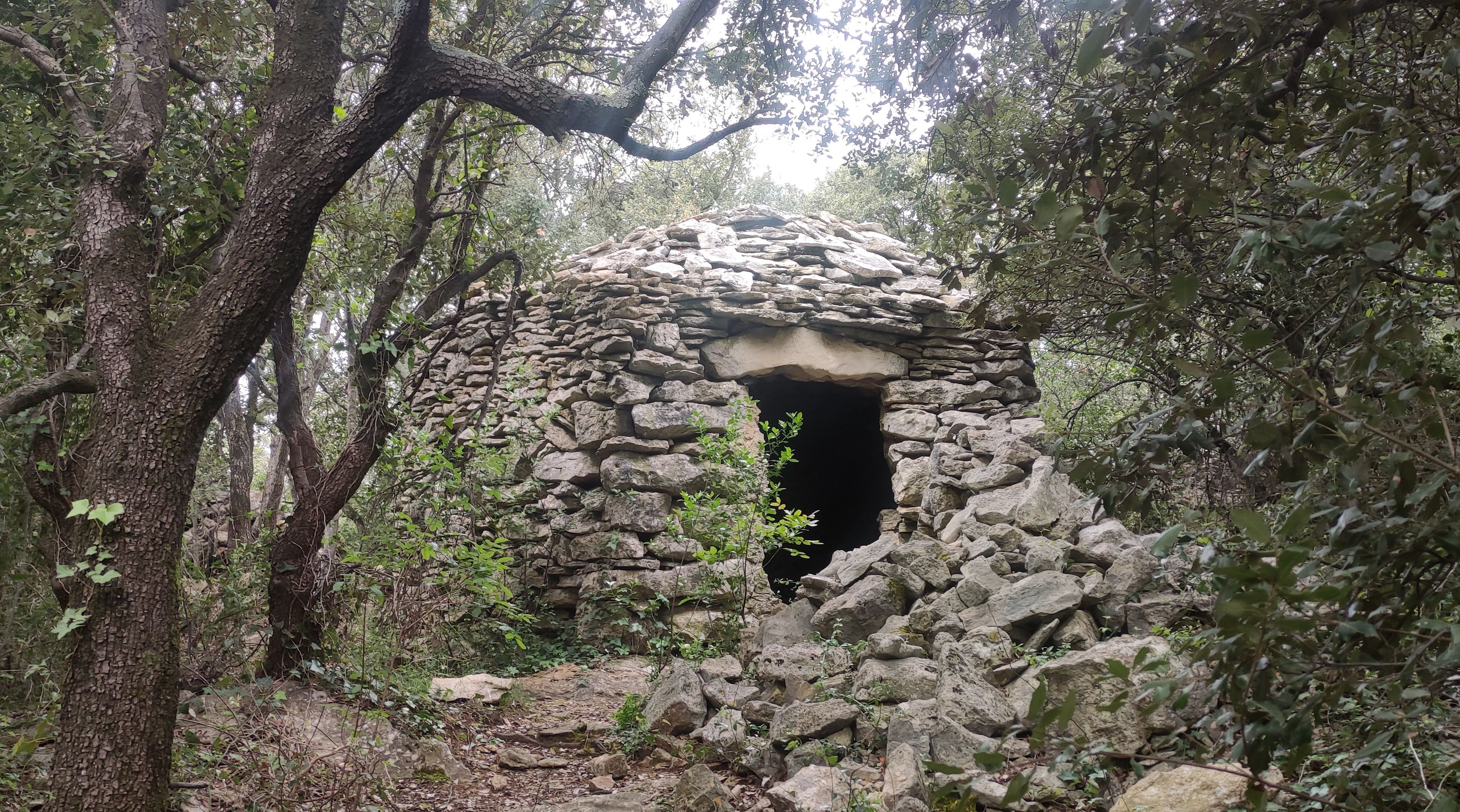 Cette borie est un peu moins connue, car il faut marcher une cinquantaine de mètres sur un sentier, pour la découvrir insérée dans les bois.